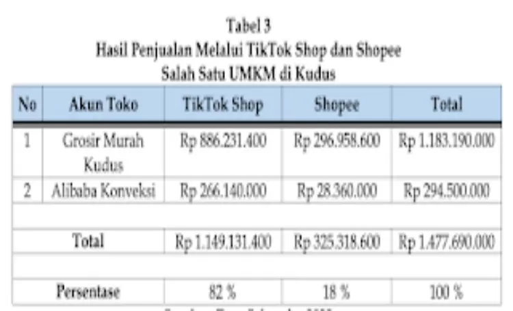 Dari tabel tersebut, dapat disimpulkan bahwa TikTok Shop memiliki potensi penjualan yang lebih besar dari Shopee. Meskipun akun kedua UMKM tersebut memiliki banyak pengikut, mayoritas pelanggan lebih memilih menggunakan TikTok Shop.