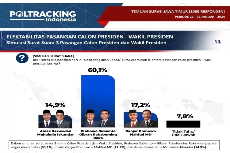 "Tren pergerakan elektoral Prabowo Subianto di Jawa Timur konsisten mengalami tren kenaikan sejak Juni 2023. Kenaikan signifikan terjadi dari rentang September 2023 ke Januari 2024 (19.5%), dimana dalam rentang tersebut Prabowo Subianto dipastikan berpasangan dengan Gibran Rakabuming Raka," tulis Poltracking Indonesia dalam paparan hasil surveinya.